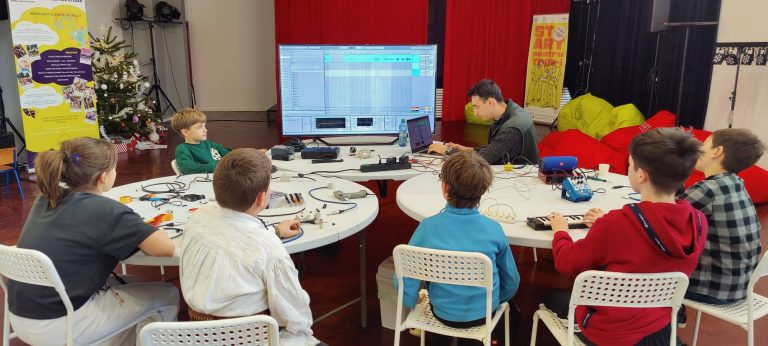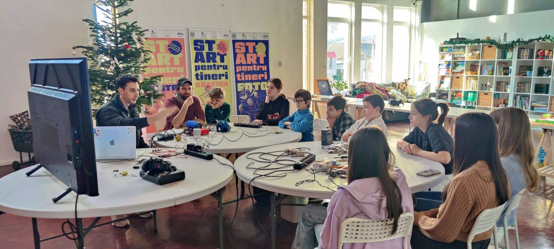 Pe lângă vizitarea instalației, tinerii din comunitate au participat la un workshop de sound art, gândit ca o întâlnire practică cu tehnologia aplicată în artă. Atelierul a fost structurat în trei etape: